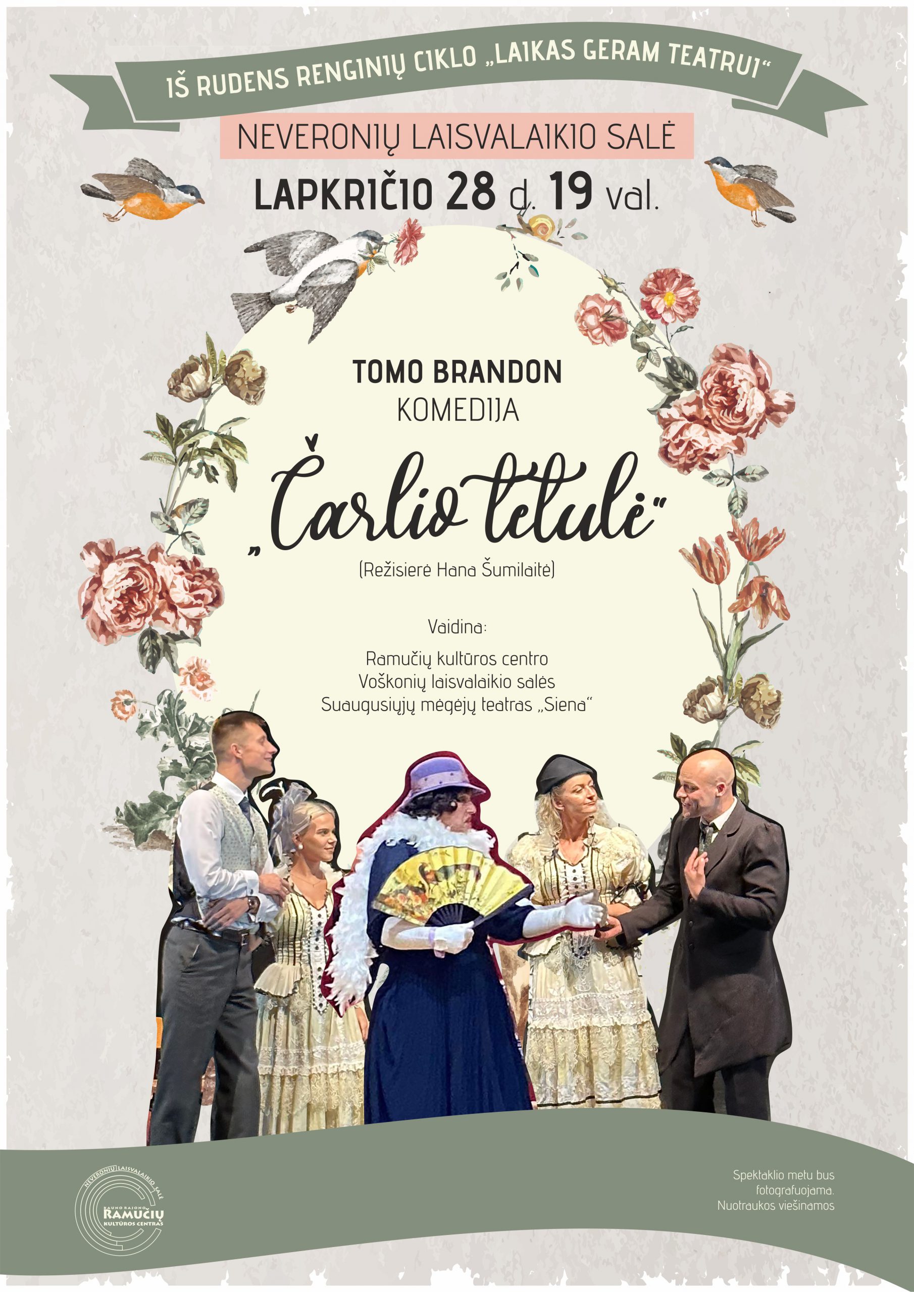 Laikas geram teatrui! Jau lapkričio 28 d. 19 val. pas mus atvyksta mūsų draugai – Ramučių kultūros centro Voškonių laisvalaikio salės teatras “Siena”. Jie parodys savo naujausią, šmaikštų, nuotaikingą, užburiantį spektaklį “Čarlio tetulė”. Režisierė Hana Šumilaitė. Spektaklis nemokamas!