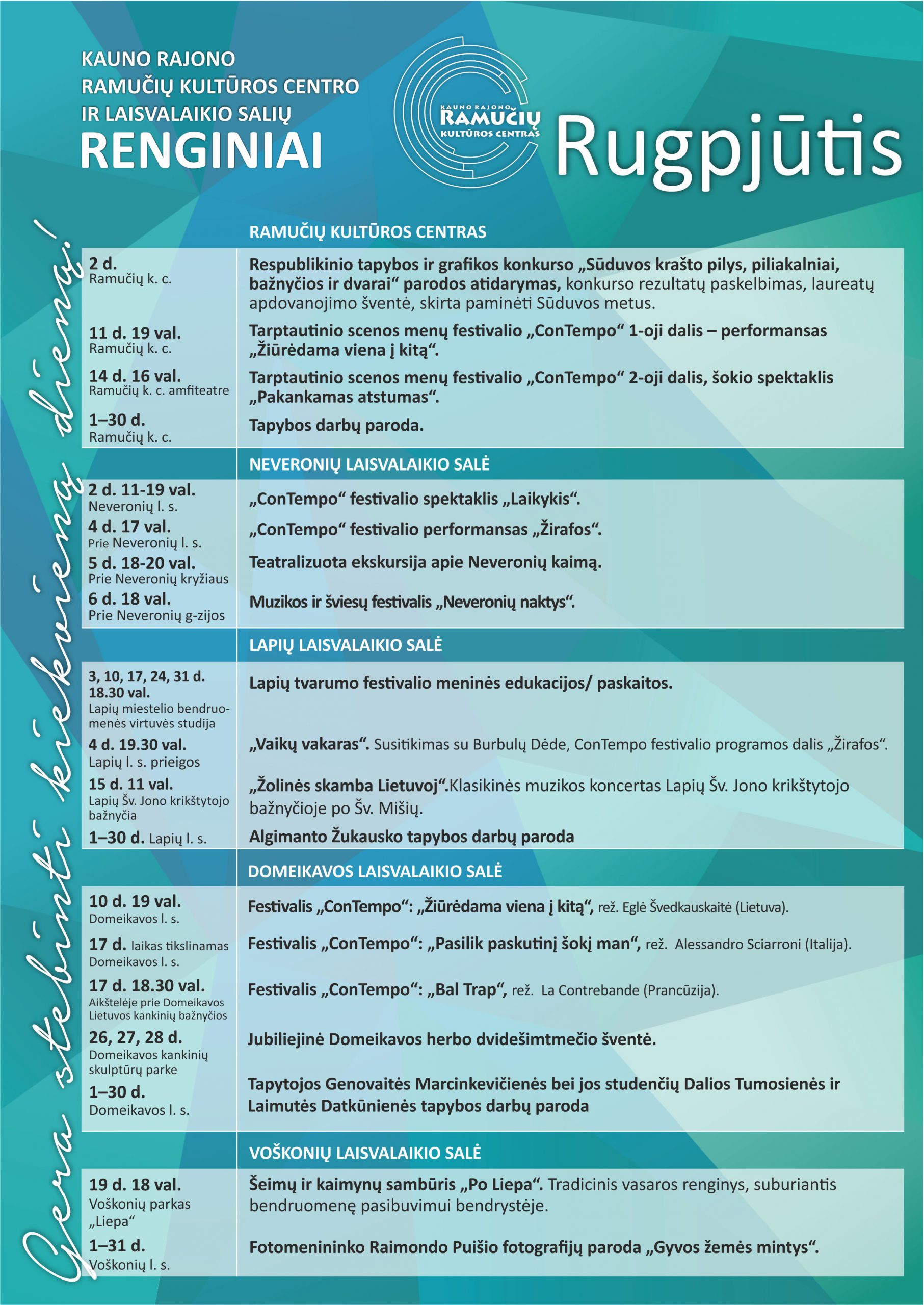 Rugpjūtis jau visai čia pat, o mes Jums suruošėme gausybę renginių: nuo įvairaus žanro parodų iki tarptautinio festivalio meninių pasirodymų! Kviečiame apsilankyti!